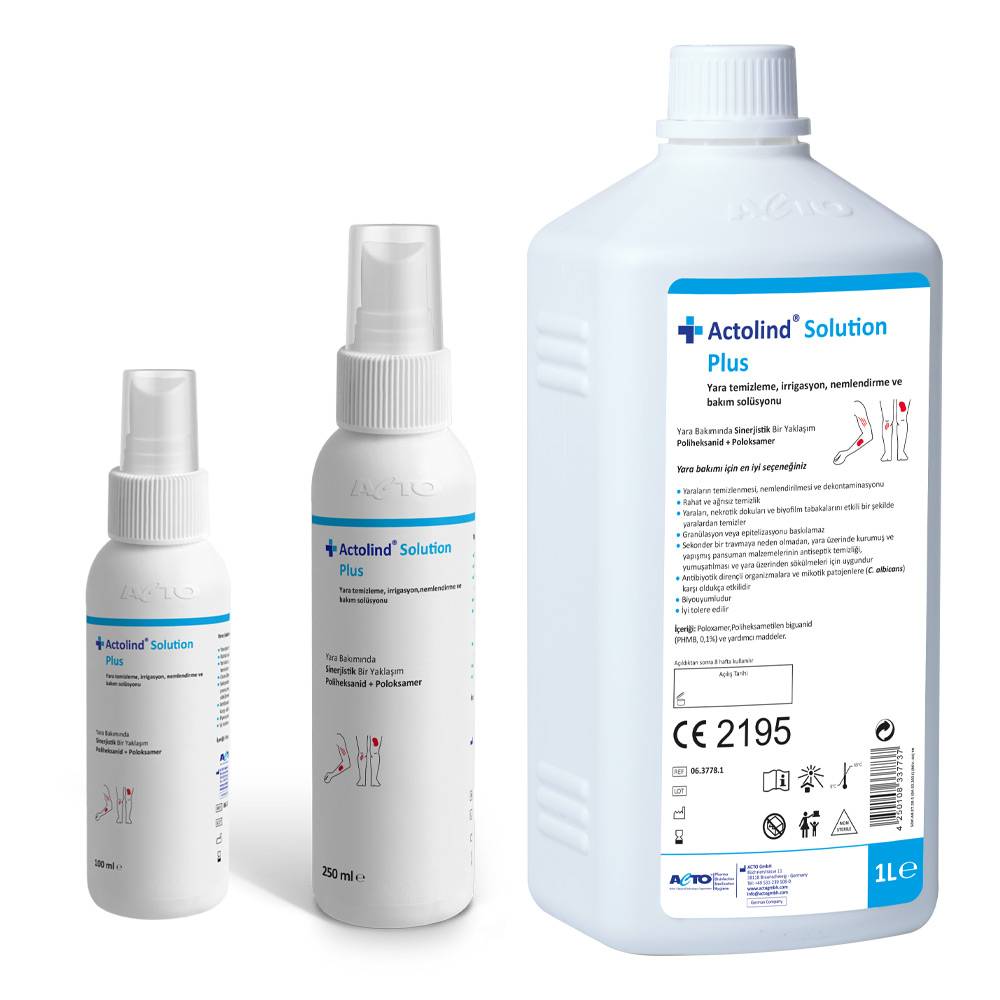Actolind® Solution Plus ist eine Lösung zur Reinigung, Spülung, Befeuchtung und Pflege, die zusammen mit Materialien wie Bandagen, Verbänden, Wundauflagen und Wundfüllern auf akuten, chronischen und infizierten Wunden sowie bei Verbrennungen ersten und zweiten Grades verwendet wird. Es ist ebenfalls geeignet zur antiseptischen Reinigung, Einweichung und Entfernung von Verbandstoffen, die getrocknet sind und der Wunde anhaften, ohne ein sekundäres Trauma zu verursachen.