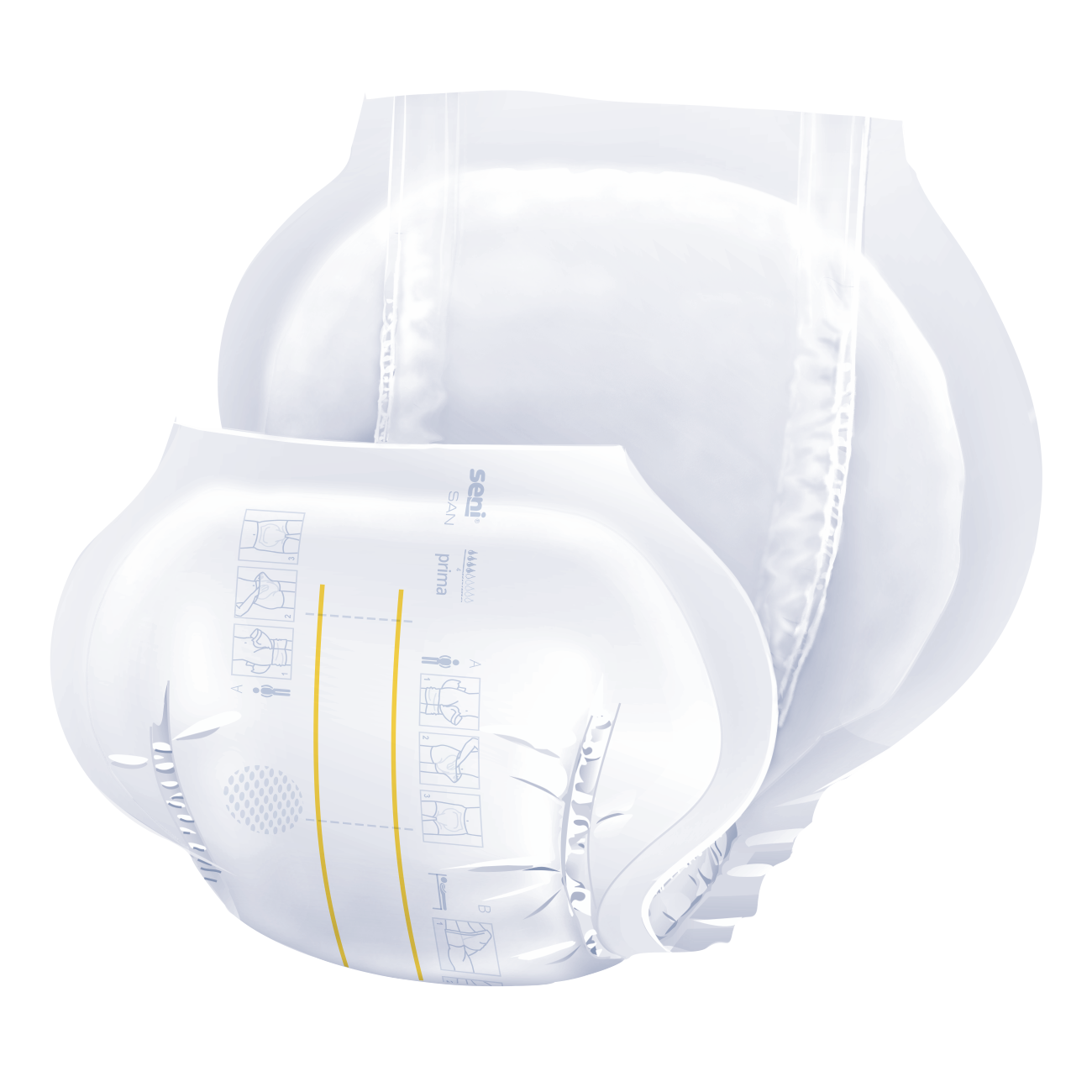Die atmungsaktiven Inkontinenzvorlagen sind für den Schutz bei Inkontinenz bestimmt. Zwei anatomisch geformte Saugkissen aus Zellstoff (Seni San Prima - ein Saugkissen) mit Superabsorber. Die spezielle EDS-Schicht sorgt für eine schnelle Verteilung und Aufnahme der Flüssigkeit in den Saugkern. Flüssigkeitsabweisender, seitlicher Auslaufschutz mit elastischem Garn (nach außen gerichtet) im Schrittbereich schützt vor Flüssigkeitsauslaufen. Haftender Feuchtigkeitsindikator – zwei gelbe Streifen, die unter Flüssigkeitseinfluss die Farbe in blau-grün ändern. Atmungsaktive Außenschicht.ROHSTOFFE