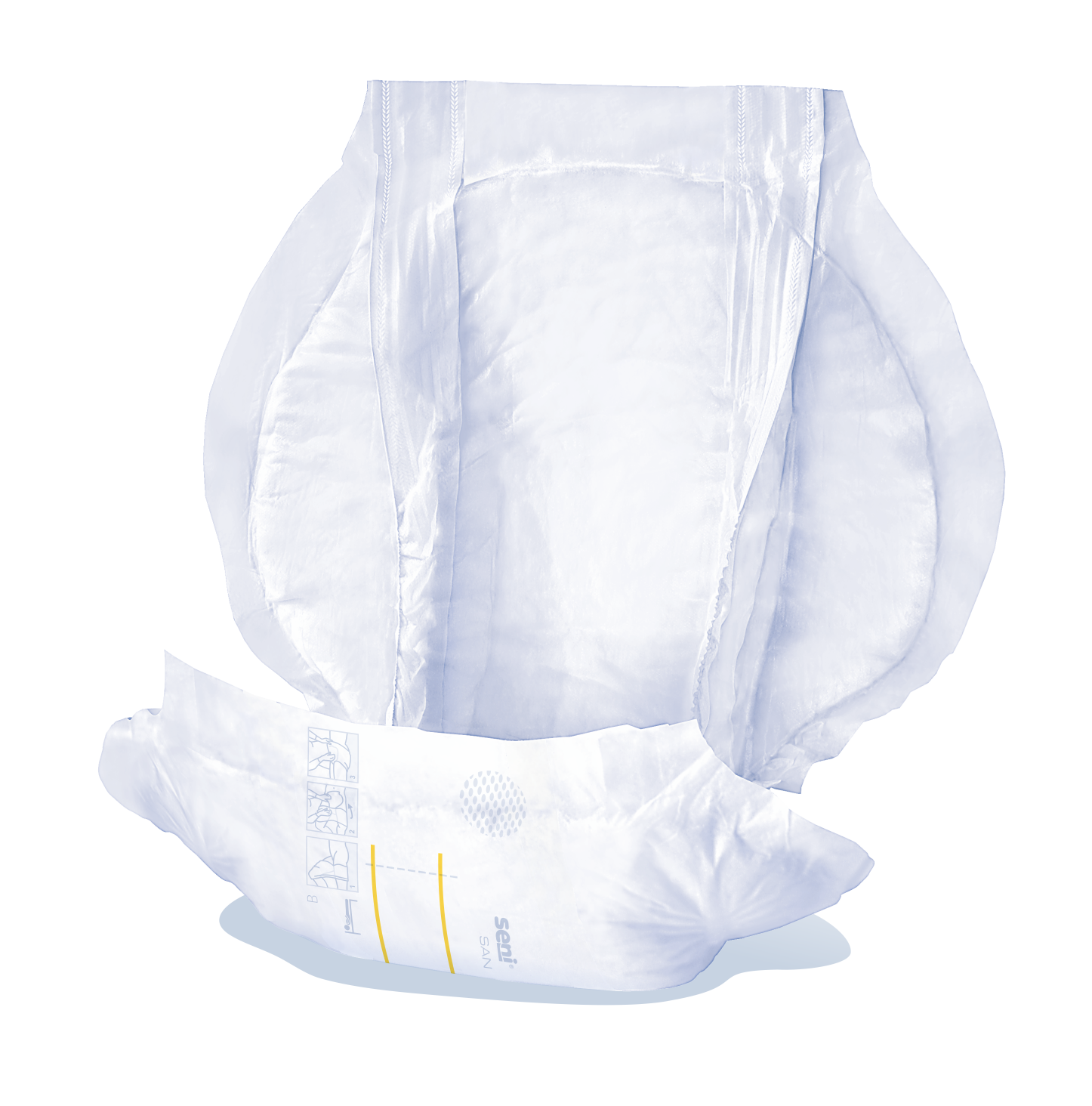Die atmungsaktiven Inkontinenzvorlagen sind für den Schutz bei Inkontinenz bestimmt. Zwei anatomisch geformte Saugkissen aus Zellstoff (Seni San Prima - ein Saugkissen) mit Superabsorber. Die spezielle EDS-Schicht sorgt für eine schnelle Verteilung und Aufnahme der Flüssigkeit in den Saugkern. Flüssigkeitsabweisender, seitlicher Auslaufschutz mit elastischem Garn (nach außen gerichtet) im Schrittbereich schützt vor Flüssigkeitsauslaufen. Haftender Feuchtigkeitsindikator – zwei gelbe Streifen, die unter Flüssigkeitseinfluss die Farbe in blau-grün ändern. Atmungsaktive Außenschicht.ROHSTOFFE